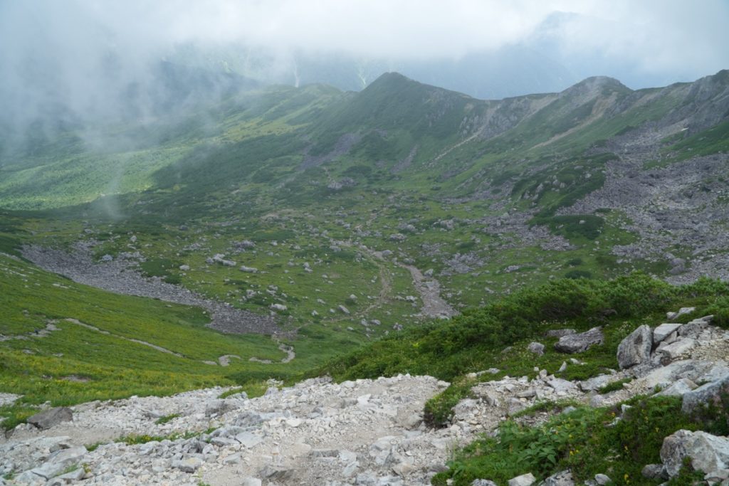 もうひとつのルートは、カールを通っていくコース。黒部五郎ノ肩から激下りして行きます。