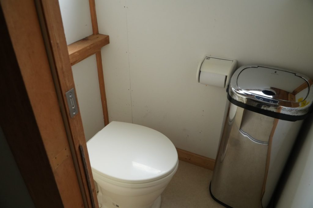 バイオ式なので少し臭いますが、気にならない程度。トイレットペーパーはゴミ箱に入れますが、このゴミ箱がなんと自動でびっくり。