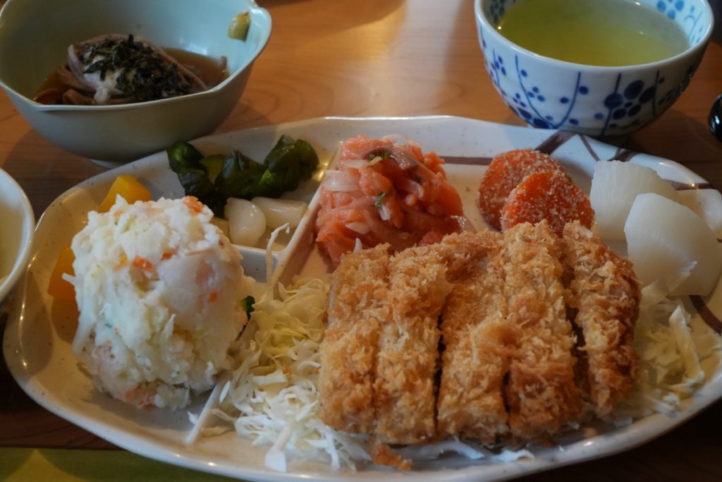 メインはとんかつ、小鉢にはおそば。付け合わせのサーモンマリネがすごくおいしかった。