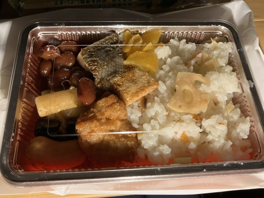 朝食はお弁当に替えました。朝起きたら、名札付きで受付に置いてあるスタイル。中身はちらし寿司とおかずでした。