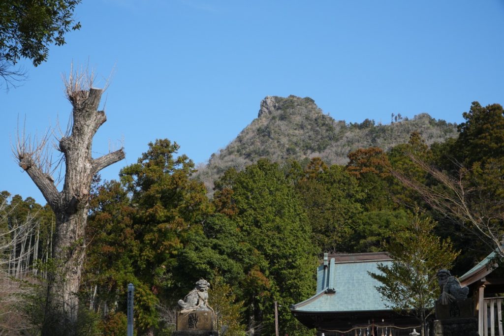 神社から見上げる伊予ヶ岳。山頂が岩岩なのが見えます。
