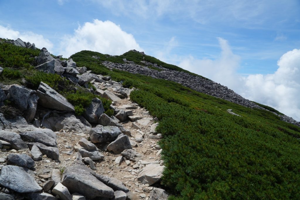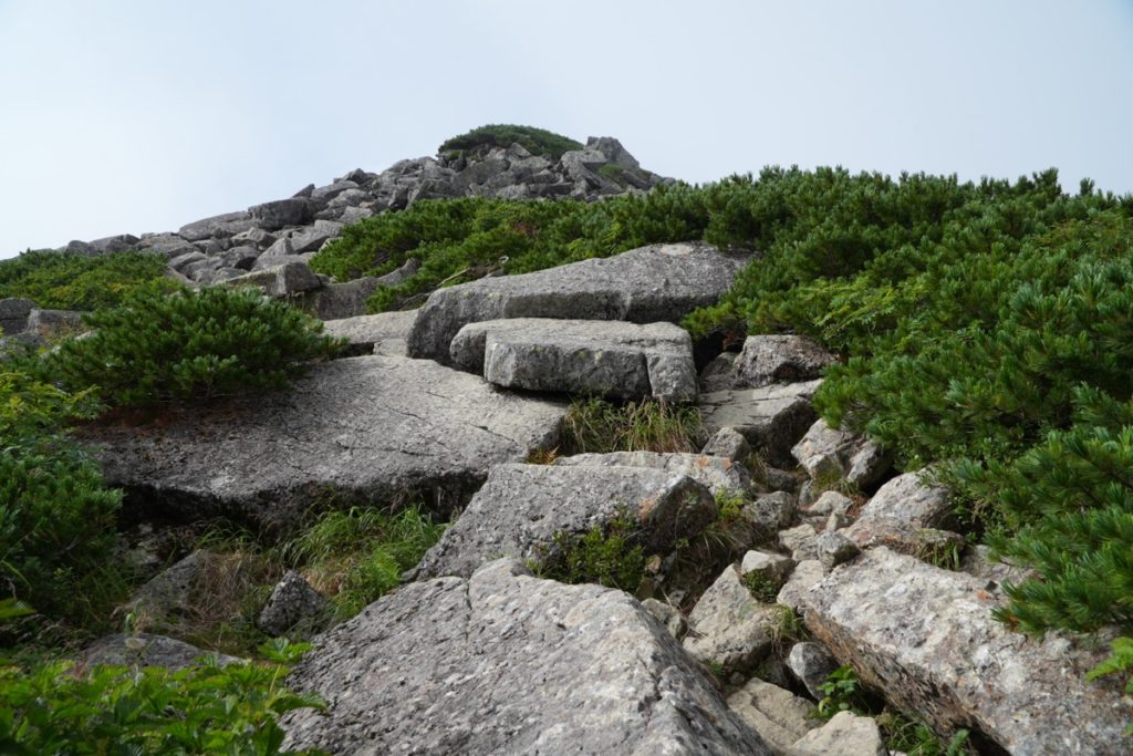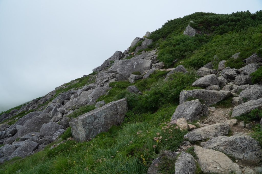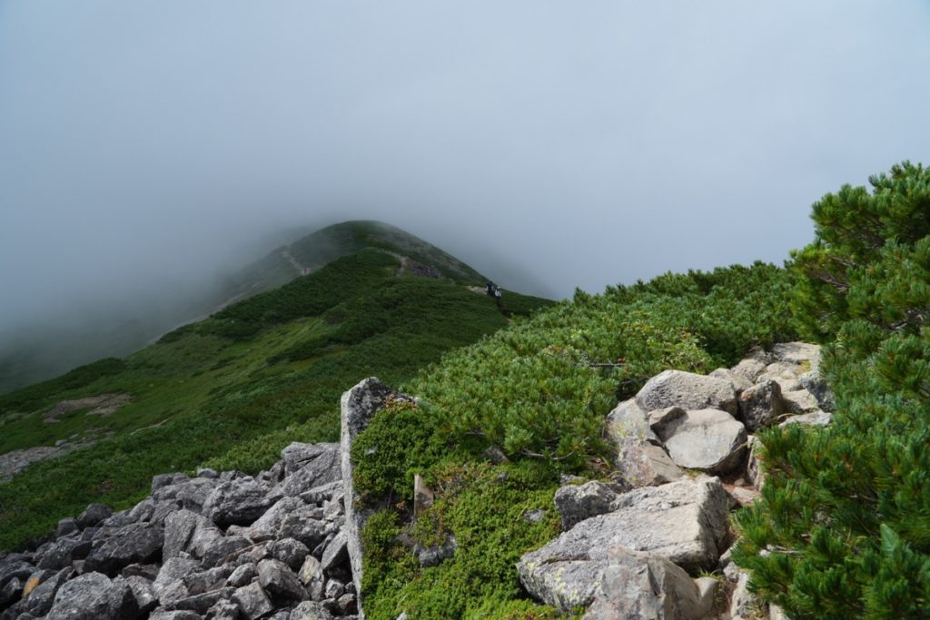 腰ほどもあるハイマツの道になりました。雲も湧いてきて、雷鳥に会えるかなと期待しつつ歩きます。