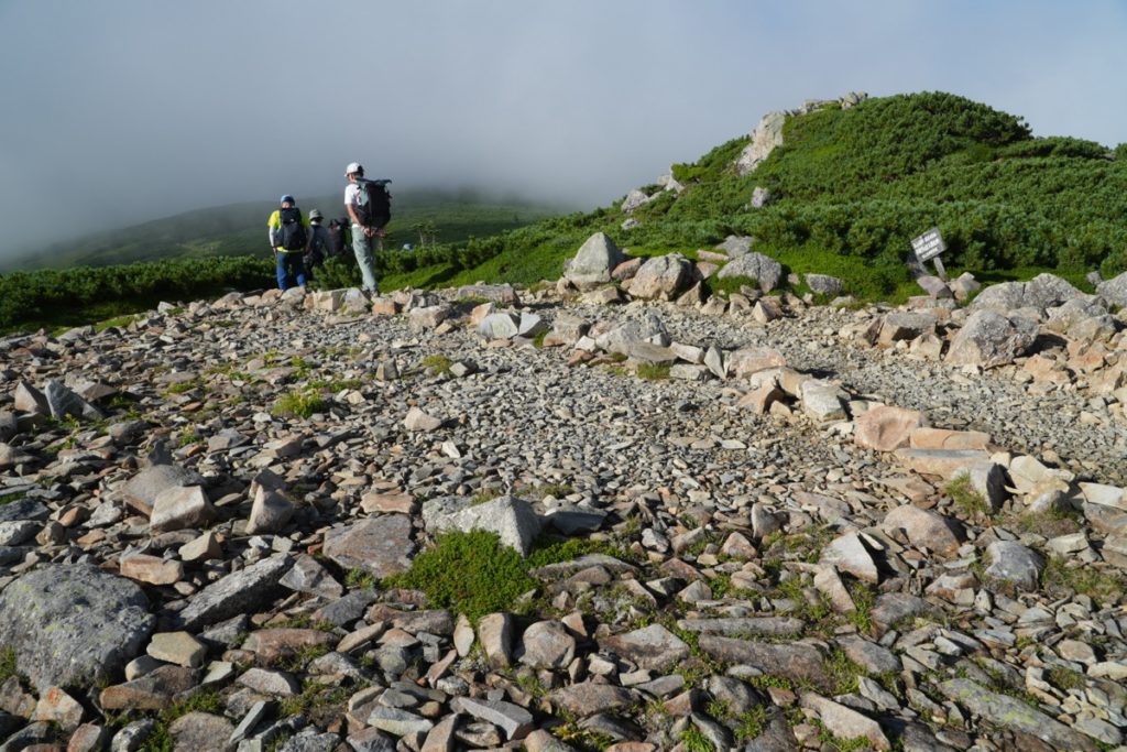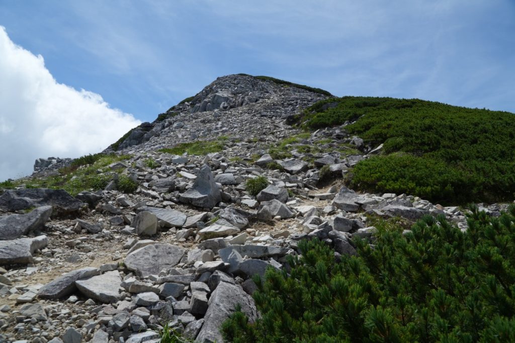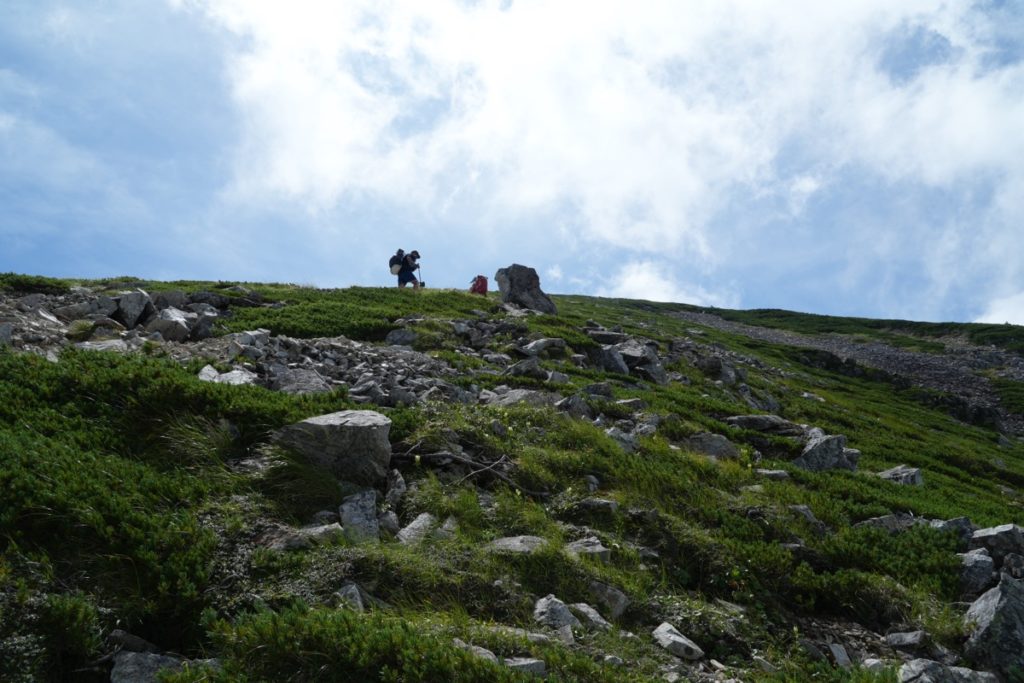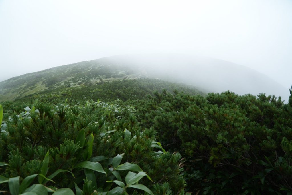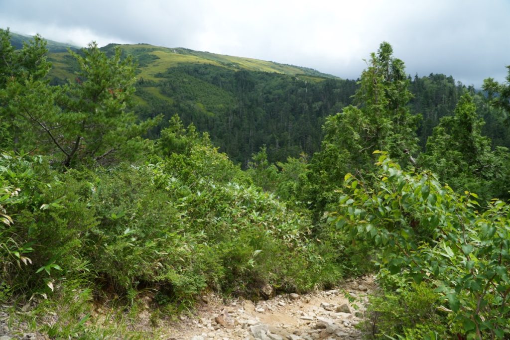 腰ほどもあるハイマツの道になりました。雲も湧いてきて、雷鳥に会えるかなと期待しつつ歩きます。