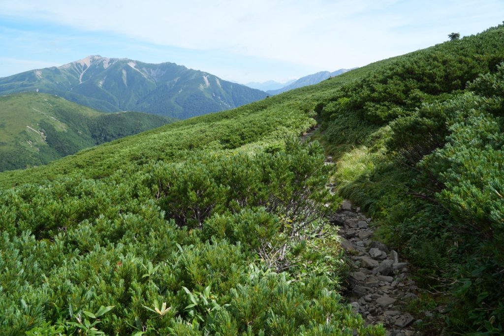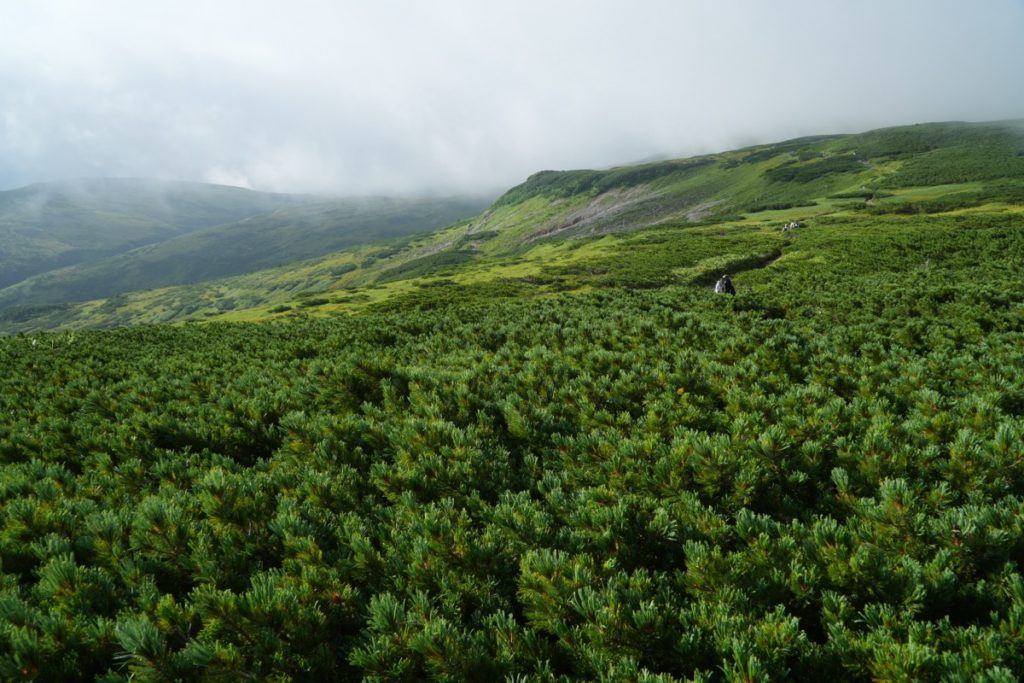濃いハイマツ帯のなだらかな道。すでに気分は最高潮です。