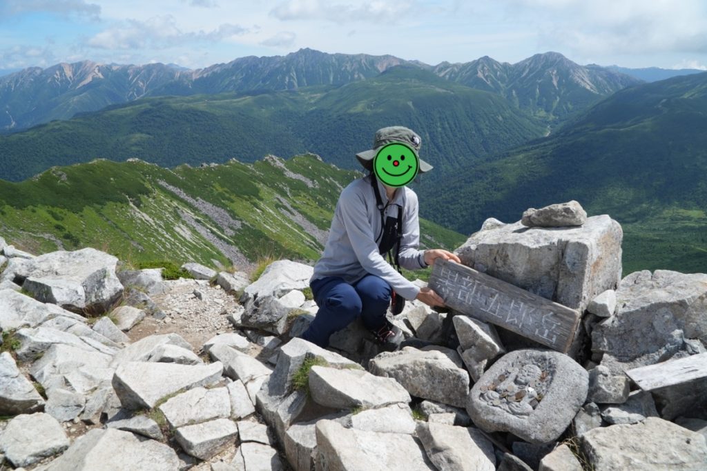 10:30、黒部五郎岳に登頂!近くにいた方と記念写真を撮り合いました。水晶岳と雲ノ平を背景に。